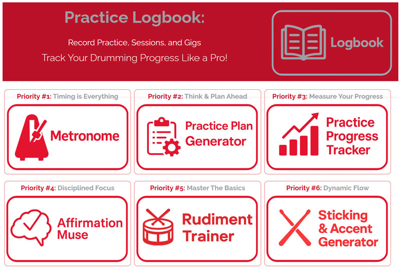 By combining smart practice strategies with tools that keep you organized, focused, and accountable, you’ll be guided step by step to plan ahead, track progress, and see real improvement every time you pick up your sticks.